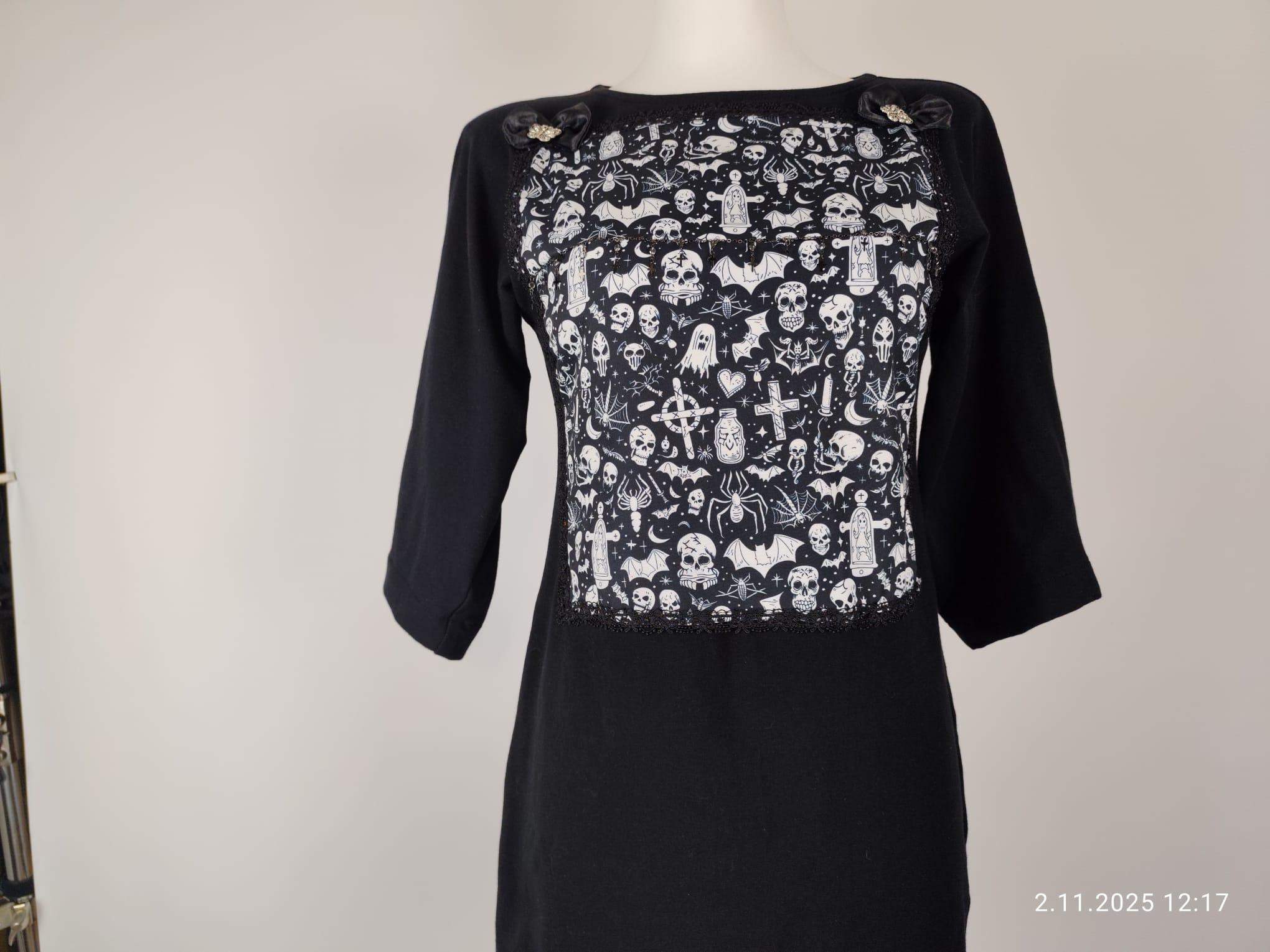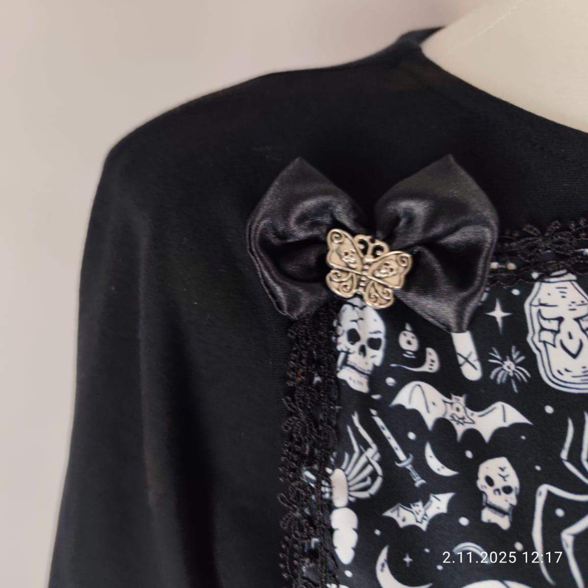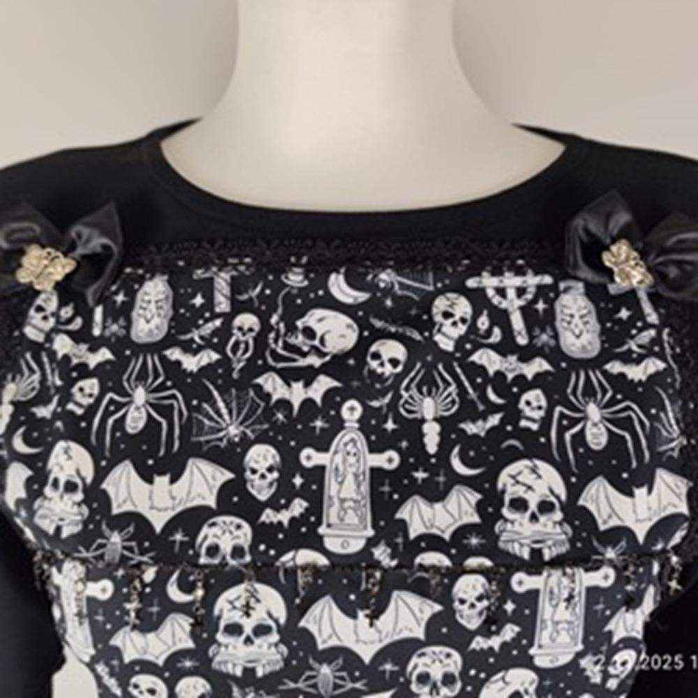 Czarny materiał kontrastuje z centralnym panelem ozdobionym unikalnym wzorem w czaszki, krzyże, nietoperze i gotyckie symbole. Subtelne kokardki z broszkami przy ramionach dodają całości mrocznego uroku i kobiecego akcentu.
