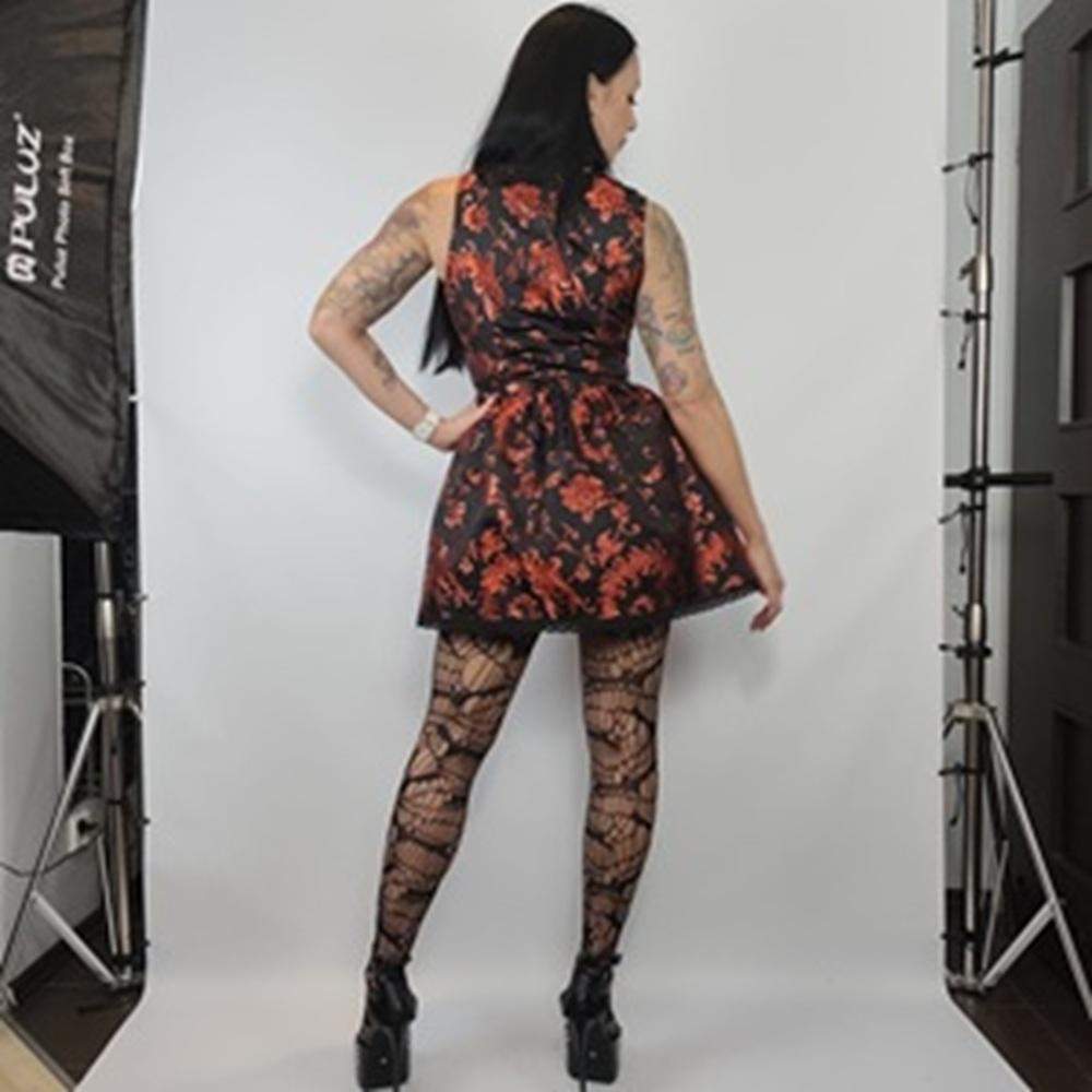 Przyciągająca wzrok sukienka w gotyckim stylu, łącząca w sobie elegancję i odrobinę mrocznej ekstrawagancji. Wykonana z czarnej żakardowej tkaniny zdobionej czerwonym, barokowym wzorem, który podkreśla wyjątkowy charakter kreacji. Dopasowana góra z subtelną kokardką i zawieszką w kształcie serca oraz rozkloszowany dół z koronkowym wykończeniem sprawiają, że sukienka prezentuje się niezwykle efektownie i kobieco.