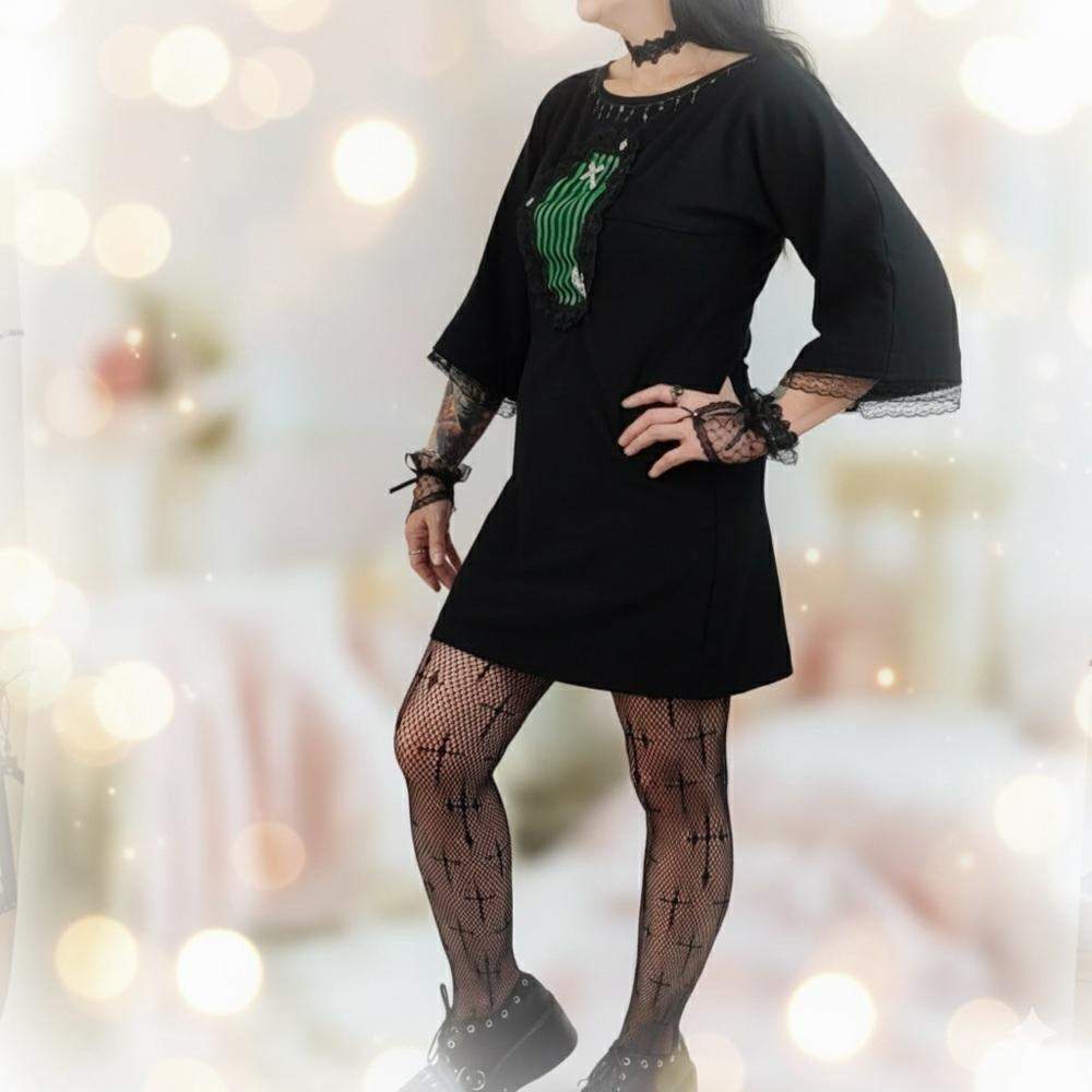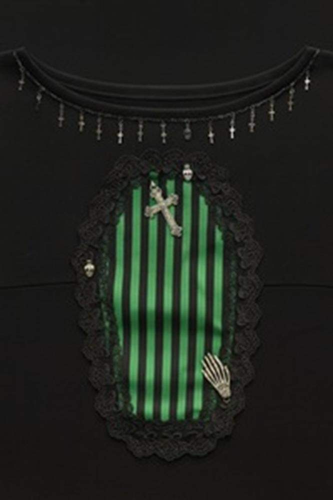Coffin Queen Dress to wyjątkowa sukienka stworzona dla miłośniczek gotyckiej estetyki i oryginalnych, ręcznie tworzonych ubrań. Centralnym elementem jest aplikacja w kształcie trumny – w zielono-czarne pasy, otoczona czarną koronką i ozdobiona metalowymi detalami: krzyżem, czaszkami oraz srebrną dłonią-szkieletorem.