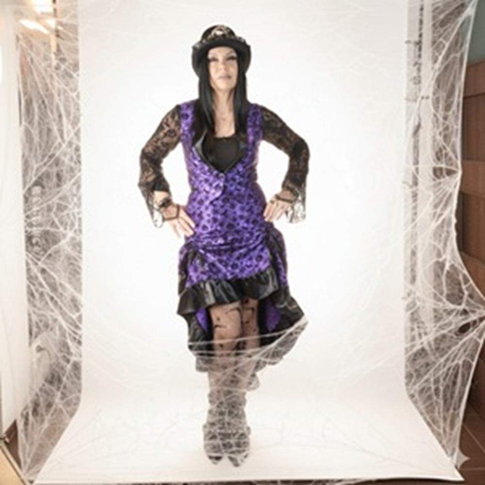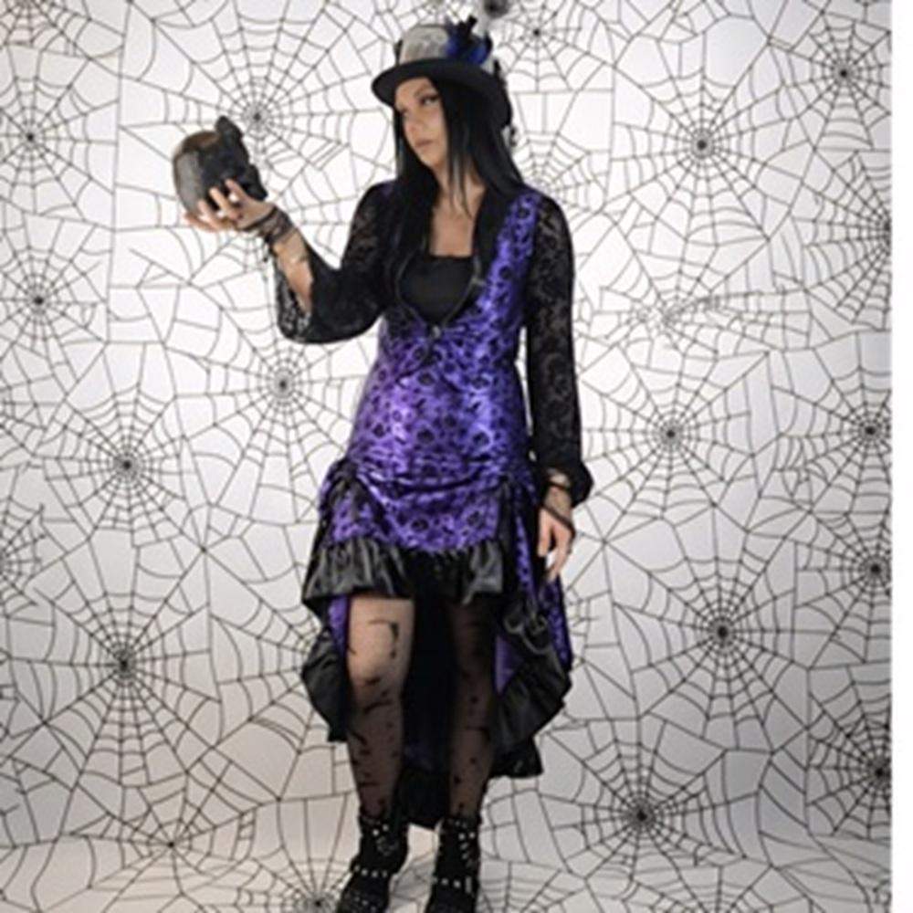 Szukasz stroju, który robi wrażenie od progu? Dark Roses to gotycka suknia o dopasowanej górze i efektownym dole typu high–low. Miękki, połyskujący materiał z subtelnym motywem (skull/damask) pięknie łapie światło, a czarne satynowe falbany dodają teatralnego charakteru. Model podkreśla talię, wysmukla sylwetkę i świetnie współgra z cylindrem, chokerem i rajstopami w pajęczyny.