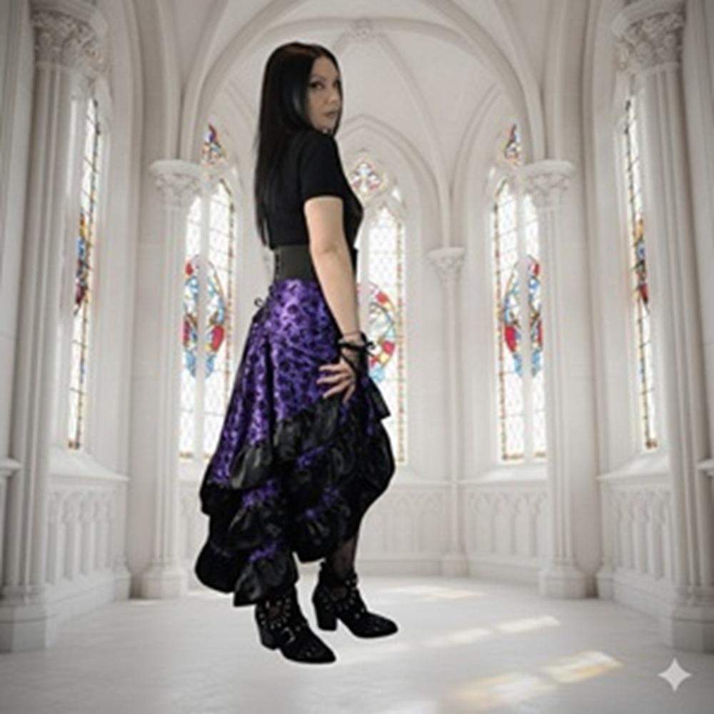 Mroczna i elegancka. Suknia łączy głęboki fiolet z czarnymi welurowymi wzorami i falbanami o kaskadowym, asymetrycznym kroju. Idealna na koncert, bal gotycki i nocne wypady.