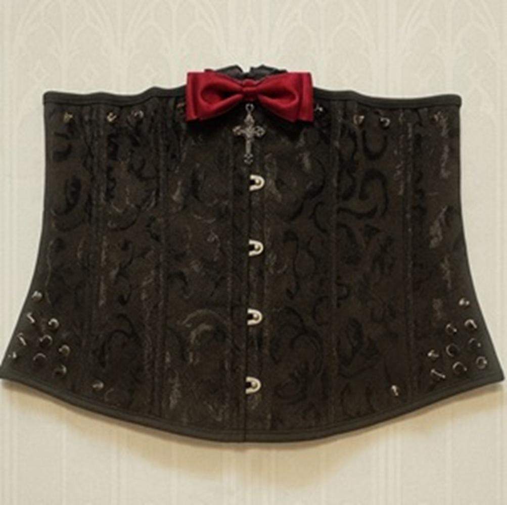 Czarny gorset żakardowy z czerwonym akcentem – satynową kokardą i zawieszką krzyża. Ozdobiony ćwiekami, idealnie podkreśla talię i dodaje gotyckiej elegancji.