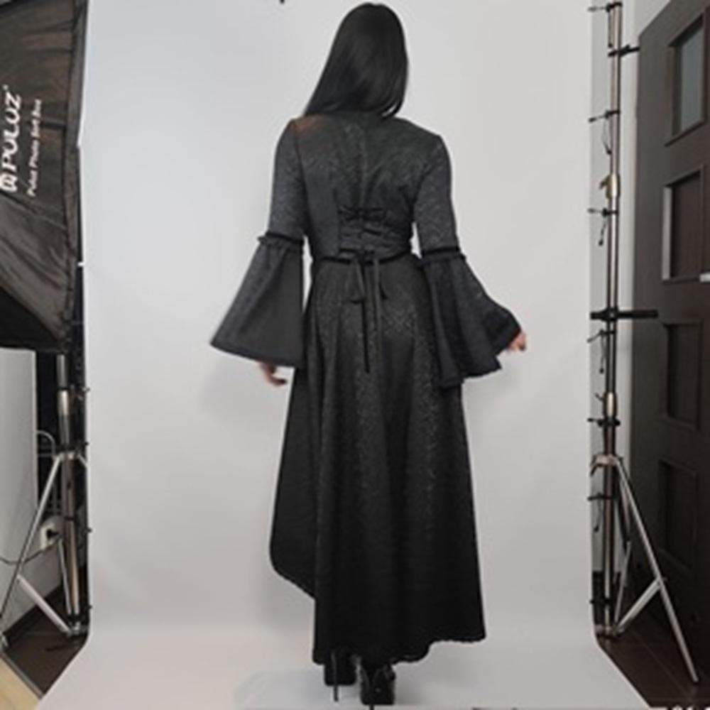 Odkryj gotycką sukienkę „Dark Morticia” – elegancki model z długim tyłem i krótkim przodem. Idealna na gotyckie imprezy, sesje zdjęciowe i wyjątkowe okazje.