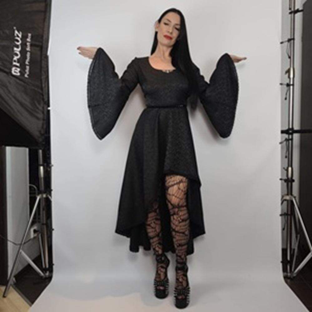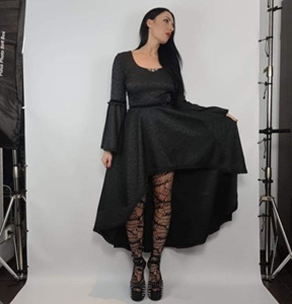 Krótki przód podkreśla nogi, a wydłużony, rozkloszowany tył nadaje sylwetce majestatycznego charakteru. Długie rękawy i klasyczny dekolt czynią ten model uniwersalnym – idealnym zarówno na gotyckie przyjęcia, klubowe wieczory, jak i alternatywne sesje zdjęciowe.