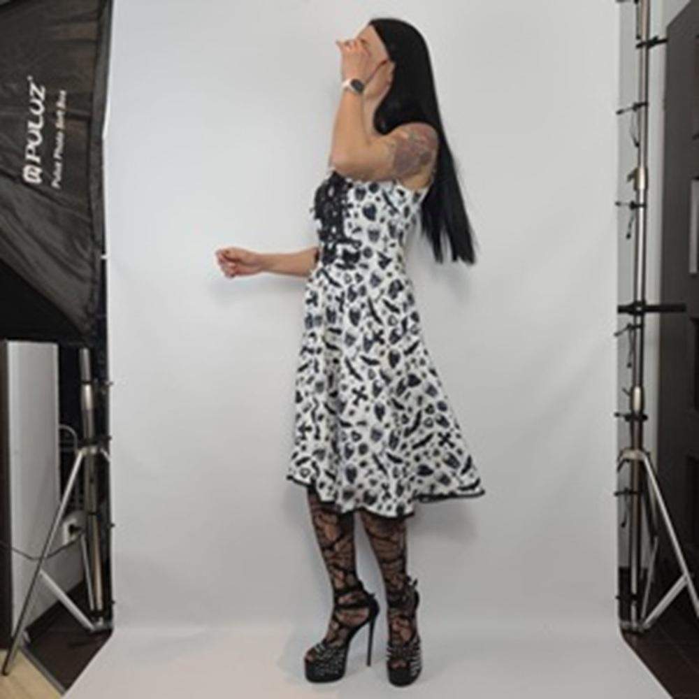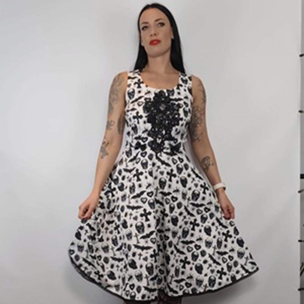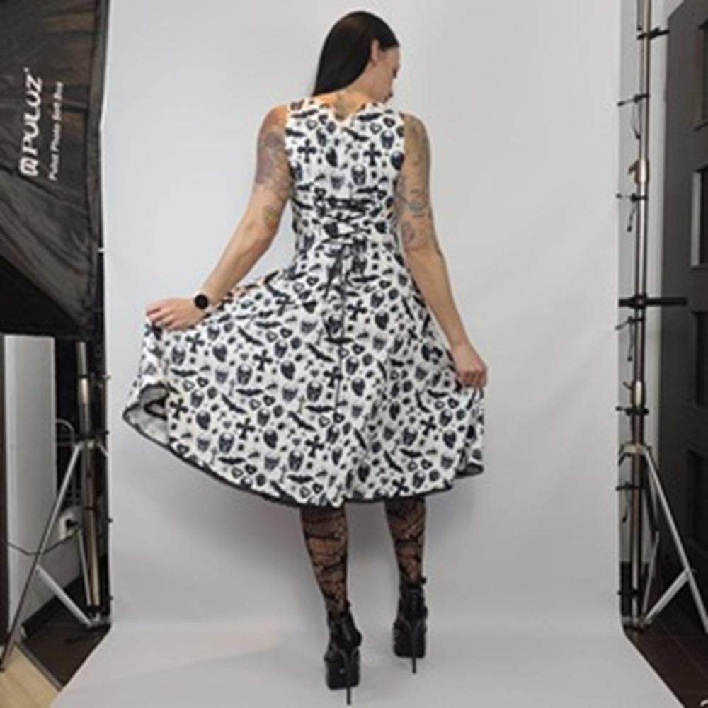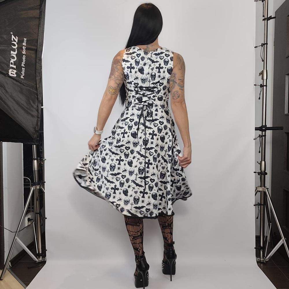 Biała tkanina ozdobiona została czarnym wzorem w czaszki, krzyże, nietoperze i pająki – motywy doskonale znane w gotyckiej symbolice. Na wysokości dekoltu znajduje się czarna koronkowa aplikacja, która pięknie podkreśla biust i talię. Rozkloszowany dół nadaje lekkości i świetnie układa się w ruchu, a bezrękawowy krój eksponuje ramiona i tatuaże.