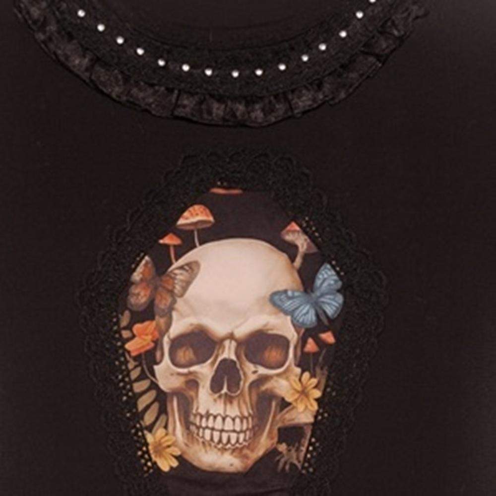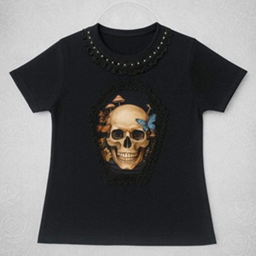 💀 Połączenie mroku i natury w gotyckim wydaniu. Czarna koszulka z dekoracyjną aplikacją w formie czaszki otoczonej grzybami, motylami i kwiatami. Całość uzupełnia ozdobny dekolt z koronką i błyszczącymi elementami, nadając całości elegancji i charakteru.
