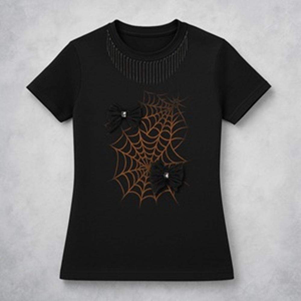 🕸️ Ciemność spotyka subtelną elegancję. Ta czarna koszulka to połączenie ręcznej pracy i wyjątkowego designu – z misterną pajęczyną w odcieniach miedzi oraz zdobieniami w postaci koronkowych kokardek z metalowymi czaszkami. Każdy detal podkreśla gotycki charakter, sprawiając, że to nie jest zwykły T-shirt, lecz element wyjątkowej stylizacji.