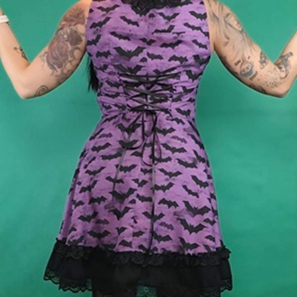 Odkryj sukienkę gotycką „Bat Queen” – fioletową z czarnymi nietoperzami i koronkową falbaną. Idealna na codzień i wyjątkowe gotyckie stylizacje. Dostępne rozmiary S/M